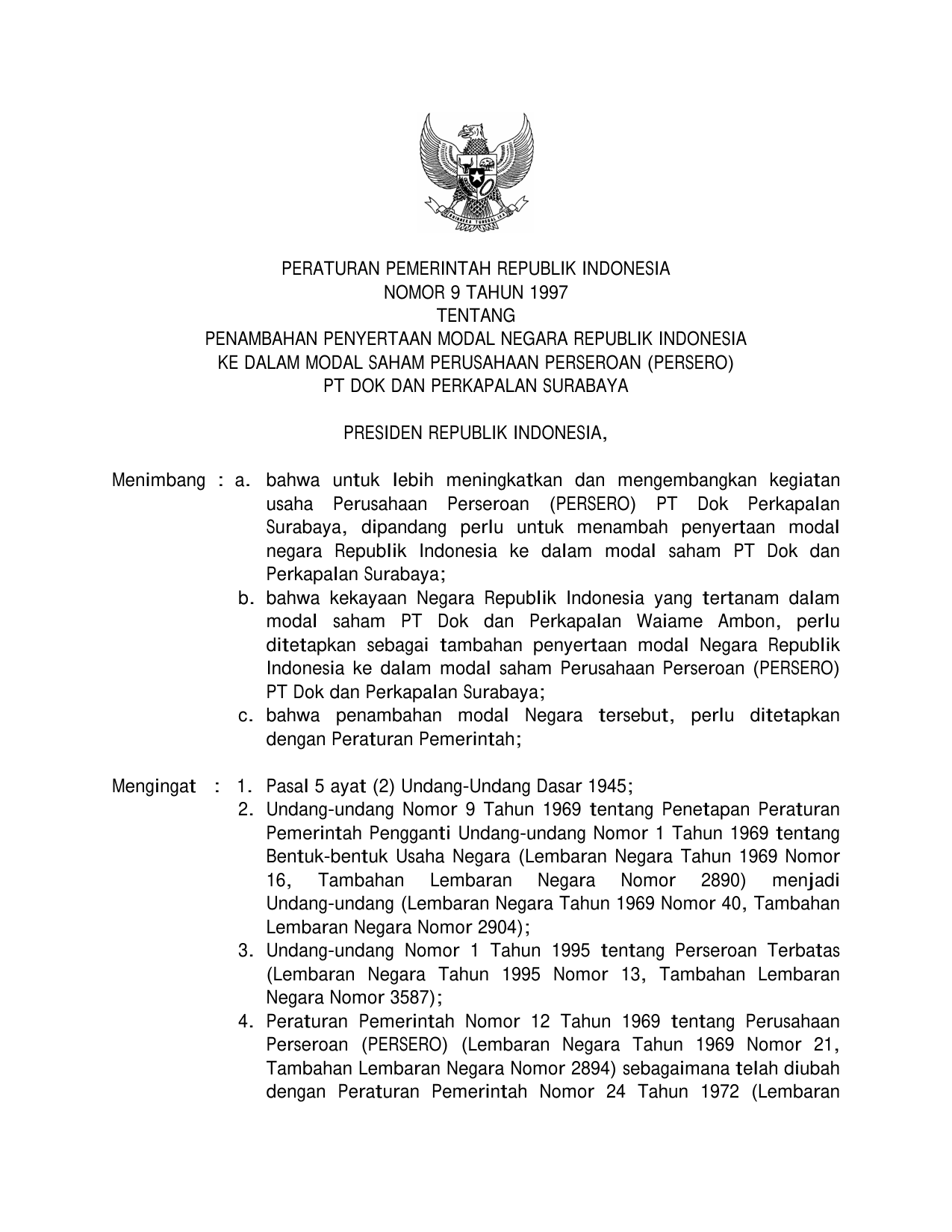PP Nomor 9 Tahun 1997 | Peraturan Pemerintah Nomor 9 Tahun 1997 tentang PENAMBAHAN PENYERTAAN MODAL NEGARA RI KE DALAM MODAL SAHAM PERUSAHAAN PERSEROAN (PERSERO) PT DOK DAN PERKAPALAN SURABAYA