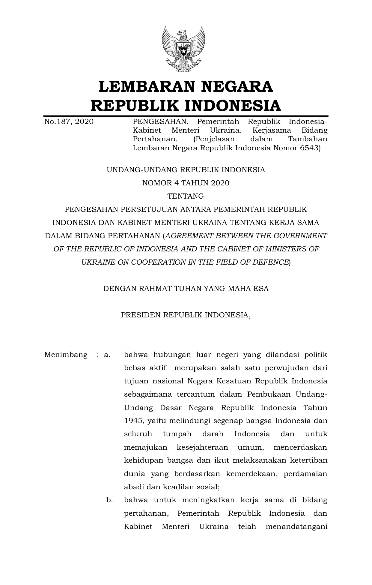 UU Nomor 4 Tahun 2020 | Undang-Undang Nomor 4 Tahun 2020 tentang PENGESAHAN PERSETUJUAN ANTARA PEMERINTAH REPUBLIK INDONESIA DAN KABINET MENTERI UKRAINA TENTANG KERJA SAMA DALAM BIDANG PERTAHANAN (AGREEMENT BETWEEN THE GOVERNMENT OF THE REPUBLIC OF INDONESIA AND THE CABINET OF MINISTERS OF UKRAINE ON COOPERATION IN THE FIELD OF DEFENCE)