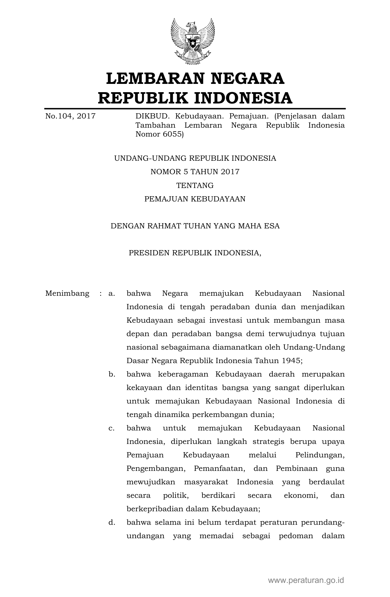 UU Nomor 5 Tahun 2017 | Undang-Undang Nomor 5 Tahun 2017 tentang Pemajuan Kebudayaan